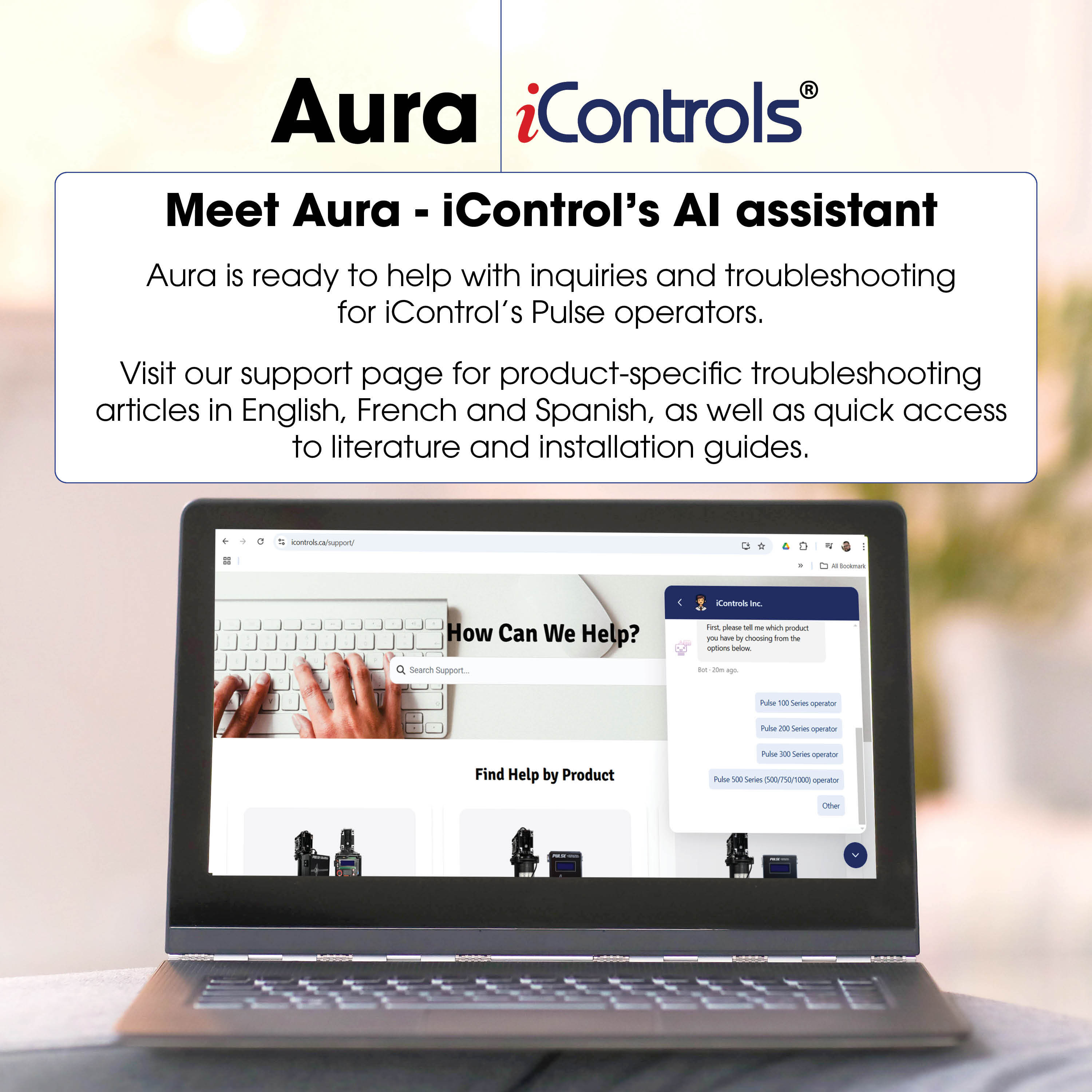 ¡Conozca a Aura, la asistente de IA de iControls para problemas de soporte técnico! Aura está aquí para ayudarle a solucionar problemas y brindarle asistencia con nuestros operadores de puerta PULSE.