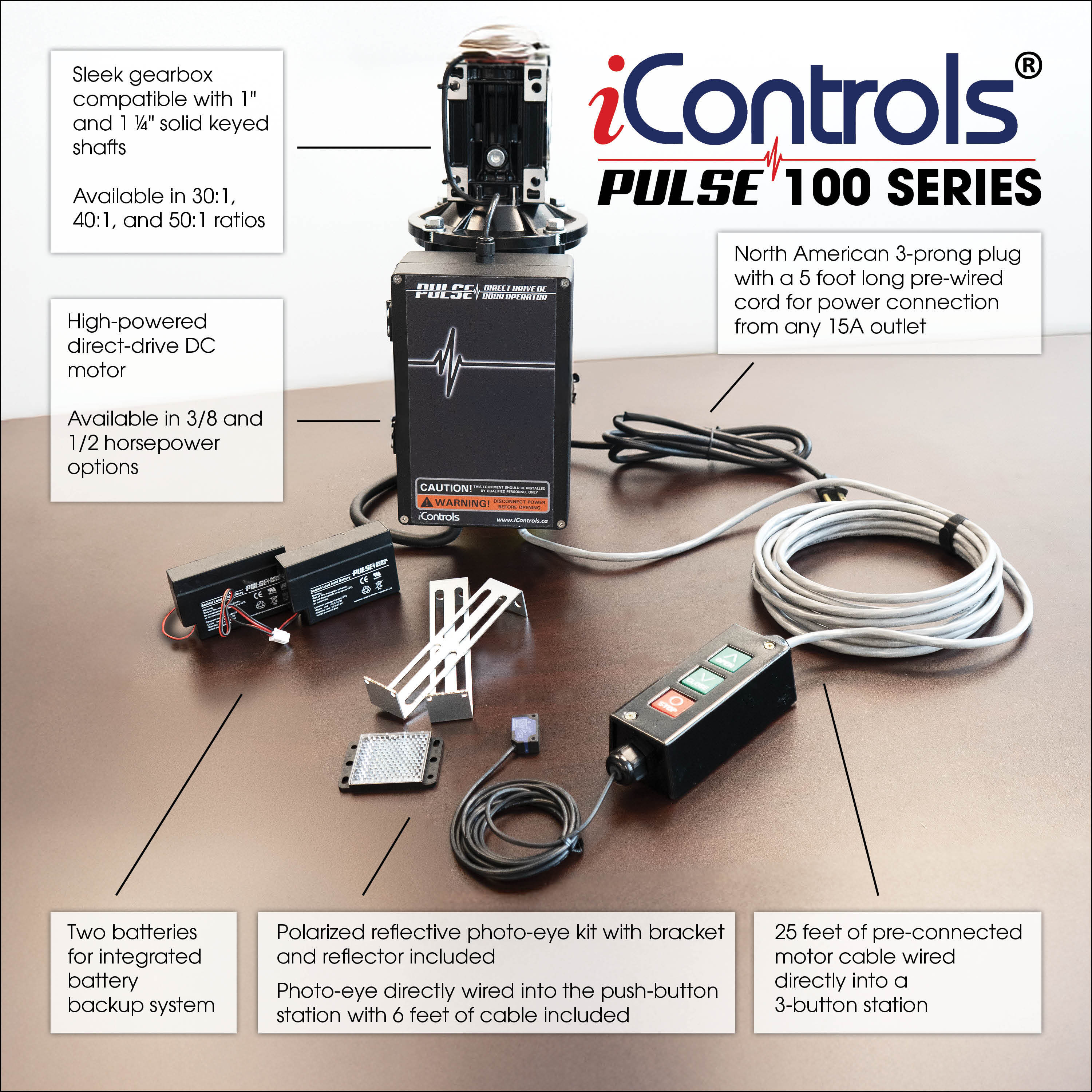 La Serie PULSE 100 es la solución perfecta para puertas de andén. Este operador está disponible en opciones de 3/8 y 1/2 HP para puertas de hasta 200 pies² y 1,000 lb. El motor está precableado directamente a una estación de 3 botones, que se conecta al sensor fotoeléctrico, haciendo la instalación extraordinariamente fácil y rápida.